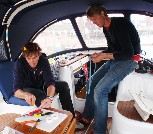 Räddningen var bara bakom hörnet, inom marinan finns ett stort båtföretag med unga trevliga grabbar som jobbade för fullt fast det var söndag. Macka från Australien och Jerome från Holland ställde upp direkt och splitsade en ny lina med betydligt högre kvalitet än den som användes i Tyskland. Kostade bara 1.500 kr.